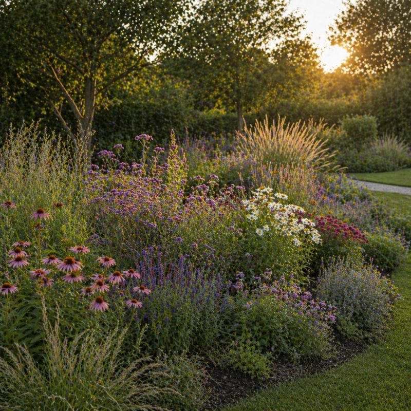 A növények összeállításánál a cél az volt, hogy egy valóban működő, vizuálisan is egységes évelő kert jöhessen létre. A válogatás a modern, természetközeli – gyakran „préri jellegűként” emlegetett – kertek logikáját követi: különböző magasságú, eltérő karakterű, mégis egymással jól együtt élő növények kerültek bele.