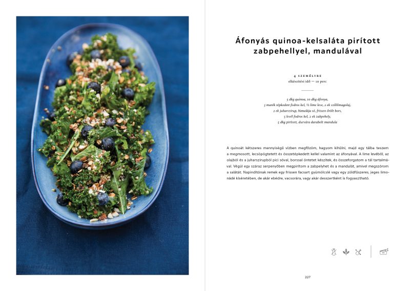 E téren szolgál inspirációként a kötet, ami egy teljes éven át, havi 8 recepten keresztül kalauzolja végig az olvasót a szezonális zöldségekre és gyümölcsökre alapuló ételek világában. A nyers vagy épp sült, skandináv, mediterrán, közel-, netán távol-keleti zöldség-, gyümölcs-, hal-, hús- vagy akár gabonasaláták néhol ismerős, máshol meghökkentő íztársításokban kerülnek bemutatásra, mindez az első kötetes szerző, Bezzegh Éva kivételesen könnyed, laza hangvételű, egyben közérthető tolmácsolásában. A könyv egyszerre szól a fiatal és középkorú, főzni szerető és tudó, világlátott városi nőkhöz és férfiakhoz, a klasszikus sütés-főzés iránt nem feltétlen, de a könnyű ételekre és változatos ízekre fogékony gasztrohipszterekhez, kezdőkhöz és haladókhoz, illetve azokhoz, akik számára az esztétika, a különleges könyvélmény egyaránt meghatározó. A kötet első nemzetközi, a megjelenés óta szintén díjat nyert német nyelvű kiadása ‘Nur Salat.’ címen limitált példányban itthon is elérhető
